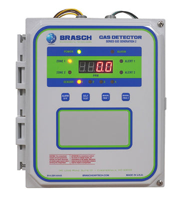 Fixed industrial gas sensor for monitoring carbon monoxide (CO) and nitrogen dioxide (NO2) and controlling HVAC equipment in conjunction with the GDCP-Touch Gas Detector Control Panel. Covers up to 9,000 sq. ft. Each sensor has an analog output.